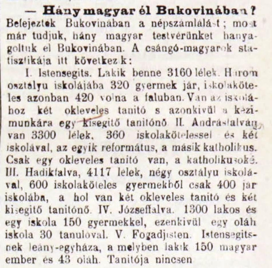 1877-ben egy Bukovinából Budapestre elszármazott pap, László Mihály drámai hangú cikkben hívta fel a közvélemény figyelmét a Kárpátokon túlra került magyarok sanyarú helyzetére."